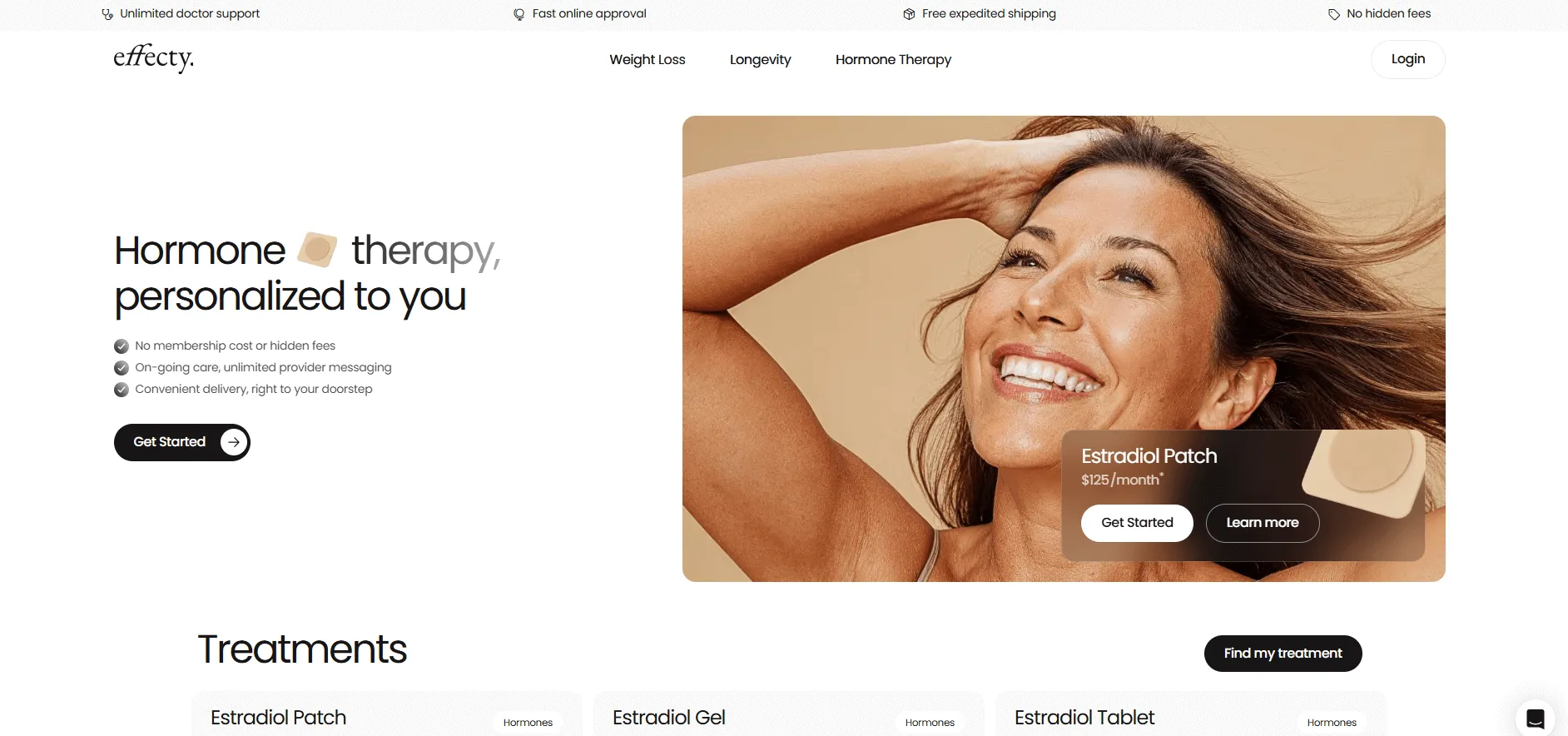 The service specifically offers bioidentical estradiol in three popular forms: patches, gels, and tablets. This variety allows for some personalization based on patient preference and medical needs. Effecty distinguishes itself with a very transparent pricing model, displaying monthly costs for different supply durations (e.g., 3-month vs. 12-month supplies) directly on their site, which is a rarity in the telehealth space.